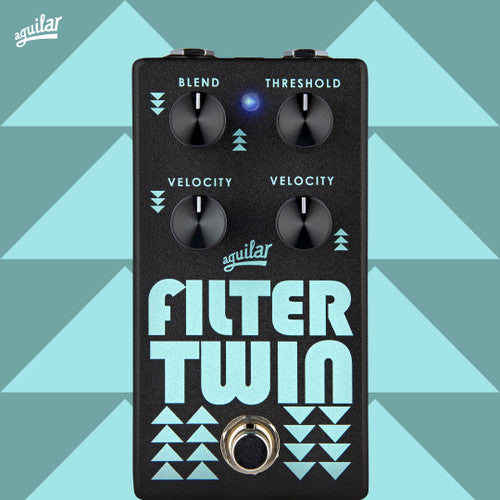 FILTER TWIN- Dual Envelope FilterIconic Aguilar circuitry gets a fresh new look!The Filter Twin uses two identical filters sweeping in opposite directions – one up in frequency, one down in frequency – to give classic 70’s-inspired funk sounds or completely new and original filter tones. Two filters sweeping at the same time give you a more organic, vocal quality and allows you to get expressive new sounds that you can’t get from other pedals.The Filter Twin offers unique filter effects via an intuitive four-knob layout. The BLEND control allows you to adjust the mix between the filters. The THRESHOLD control determines how sensitive the unit is to different playing styles. The VELOCITY controls determine the speed of each filter.