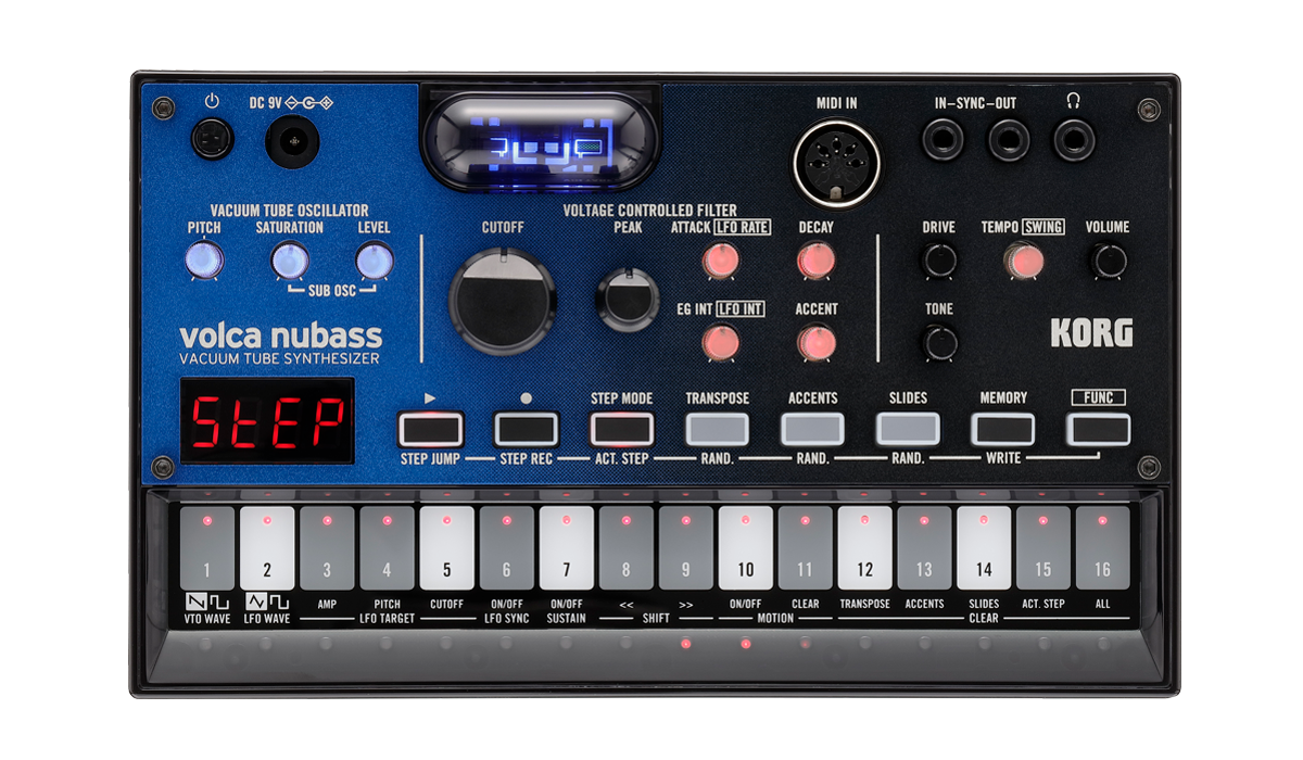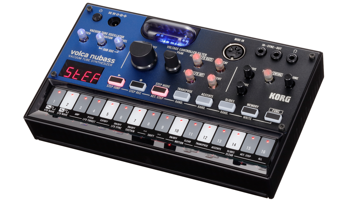 The sequencer of the volca nubass provides three functions that add the slap and slide performance techniques that are distinctive of acid bass: these transpose, accent, and slide functions are accessible and controllable through the step sequencer.