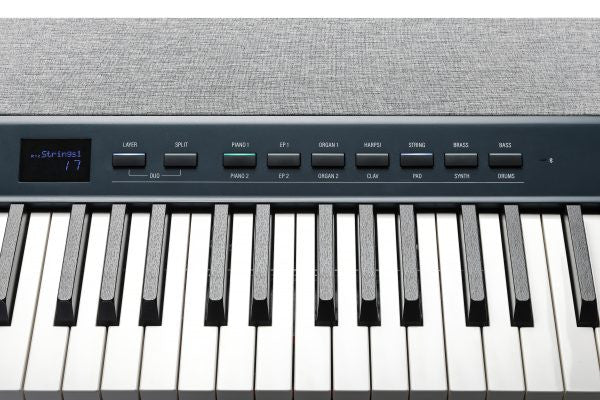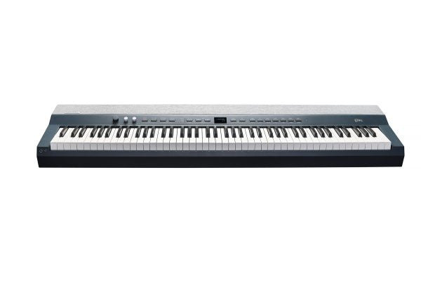 | Keyboard: 88-Note, fully weighted, hammer-action with adjustable touch sensitivity (H1 Ivory) Touch Sensitivity: 4 settings (Fixed, Soft, Normal, Hard) Polyphony: 256 Sound Sample: KORE 2.0 (2GB) Voices: 28 Performance Mode: Layer, Split, Duo (± 2 octave control : Layer, Split) Transpose: Full transposition to any key, ± 1 octave Tune: ± 100 cents Record: 1 Track, 1 Song Metronome: Start, Stop, Time signature select, Tempo control, Volume control Rhythm: Start, Stop, Rhythm pattern select, Tempo control, Volume control Effect: Reverb, Chorus, EQ (Bass, Treble) Demo: 7 Songs USB: USB MIDI (16 channels) / Audio Bluetooth: BT 5.2 MIDI & Audio Display: LCD Line In/Out: (1) 1/8" Aux In (stereo), (2) 1/4" unbalanced Headphone Out: (2) Headphone outs (1/8", 1/4") Pedal Input: (1) Sustain pedal input (one standard switch pedal included) Optional 3 pedal stand with half damper (sold separately) Amp: 2x15W Speakers: 4 speakers (2 woofer / 2 tweeter) Power: DC Power adapter: 12V 2.0A Height: 4.6" (11.7cm) Depth: 13.2" (33.5cm) Length: 51.8" (131.6cm) Weight: 43.4 lb (19.7kg) |