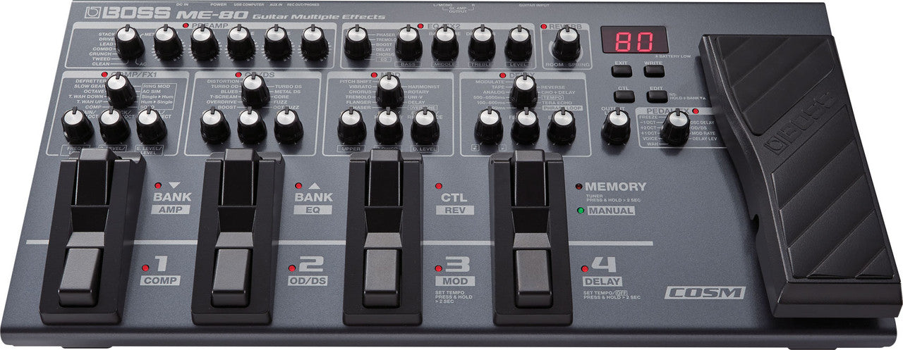 No matter what style you play, it’s easy to craft your own personal sound with the ME-80’s wide range of built-in effects. A complete history of gig-ready BOSS tone processing is at your command, from multiple overdrives and distortions to wahs, mod effects, pitch shifters, delays, and beyond. BOSS’ groundbreaking Multi Dimensional Processing (MDP) technology is represented with the unique, spacious ambience of Tera Echo and the distinctive tone-shaping possibilities of Overtone. Updated COSM preamps include new additions such as Crunch and Metal, plus an AC preamp designed for acoustic/electric guitar. The onboard expression pedal can be used for foot volume and pedal effects like wah, octave shift, and Freeze, and it’s also possible to control effects parameters such as mod rate, delay oscillation, and more for expressive real-time sound shaping.