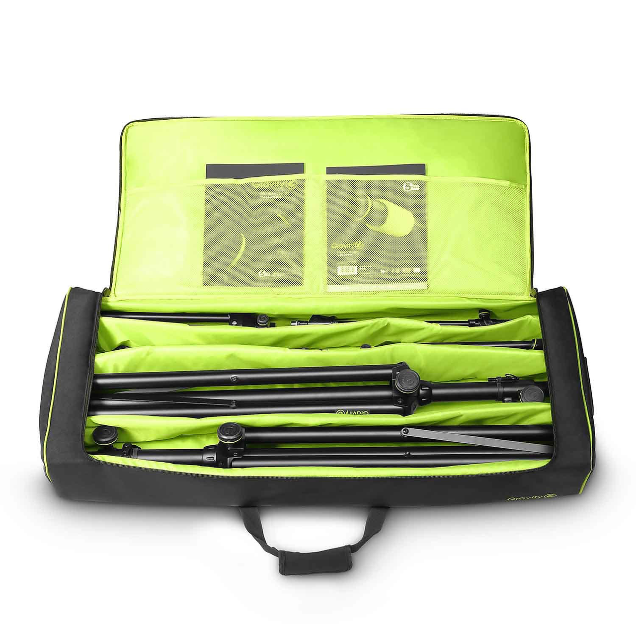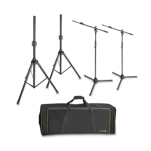 This set includes two Gravity GSP5211B tripod speaker stands and two GMS4322B microphone stands with folding tripod base and 2-Point adjustment telescoping boom in the padded heavy duty GBGSS2MS2B carry bag for convenient, easy transport.