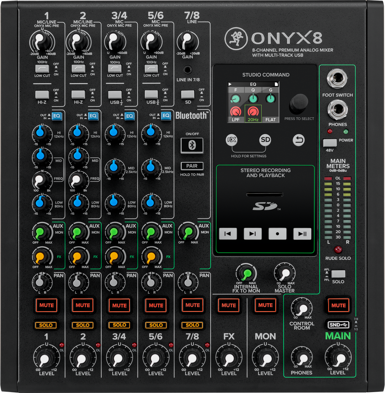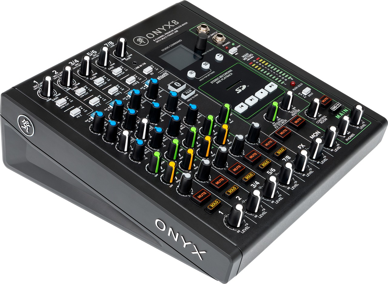 The Onyx8's USB connectivity makes recording professional-quality mixes easier than ever. Simply plug into your Mac or PC, and you're ready to tap into high-resolution 24-bit/96kHz multitrack recording. The Onyx8's full-color display and single-knob interface let you navigate FX parameters, onboard SD recording, and playback, with physical buttons for Previous, Next, Record, and Play/Pause functions.