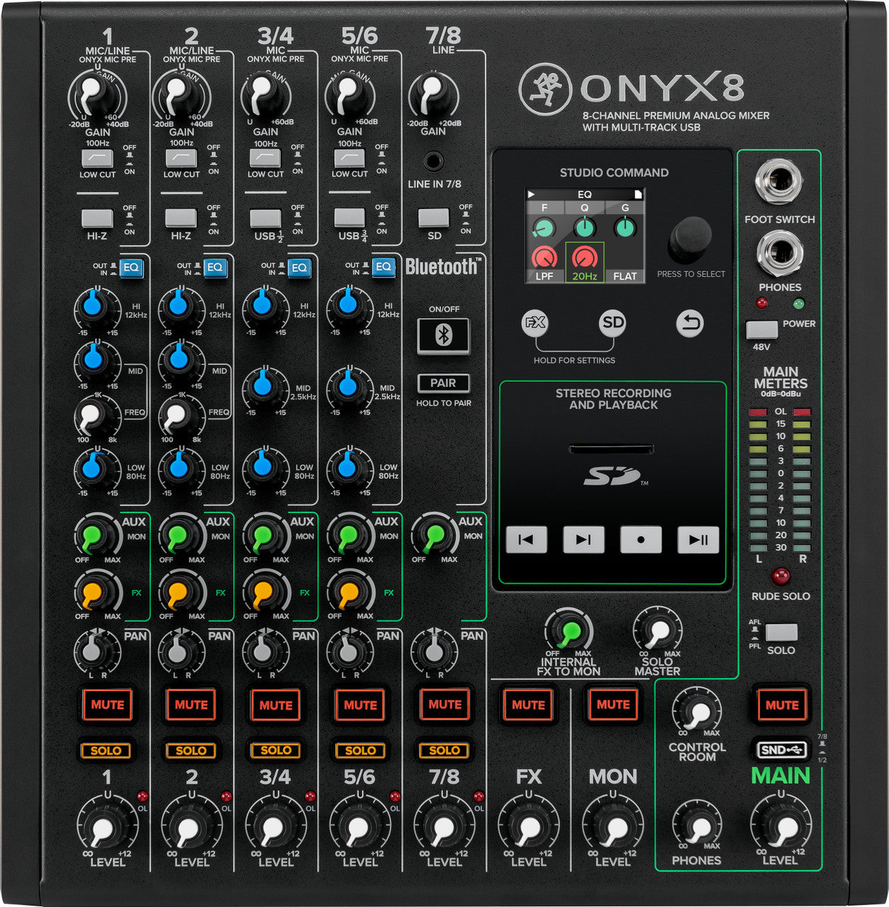 With its compact design and wide versatility, the Onyx8 analog mixer is ready to tackle practically any situation imaginable. Its stellar effects processor can handle everything from massive performances to studio recordings, live streams, and more, with adjustable parameters and a dedicated EQ making it easy to dial in that perfect sound. Bluetooth streaming capabilities allow you to connect your Bluetooth-enabled devices to any of the Onyx8's channels, with the streamed audio routed to either the Aux Sends or Main Mix.