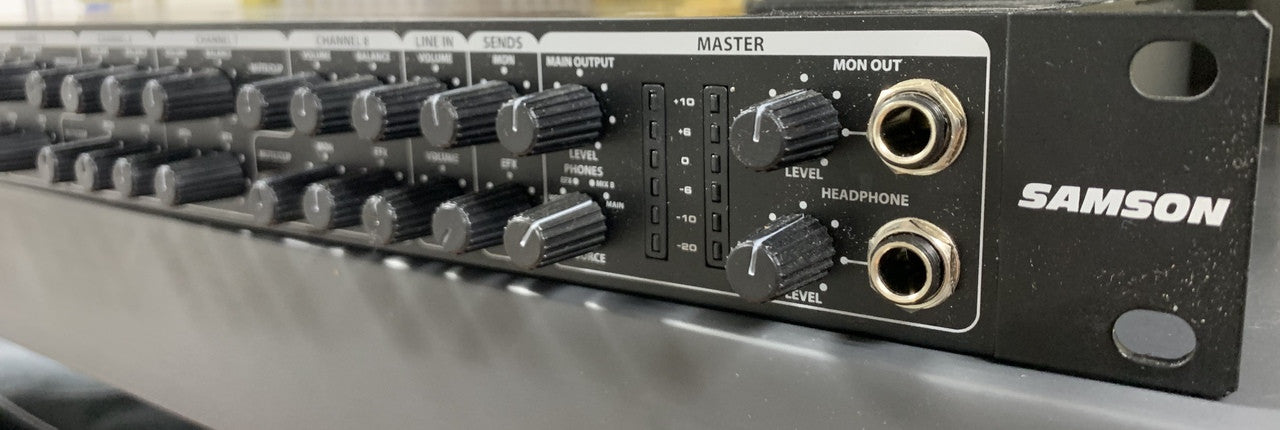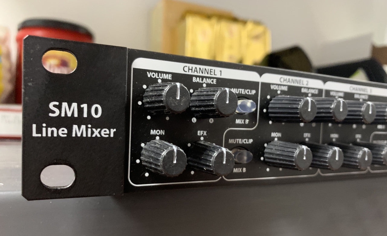 The SM10 features ten channels with 1/4-inch stereo line inputs and a balance control for each channel. Two channels include XLR mic inputs. This allows you to blend the relative levels of stereo inputs to your liking. In addition, each channel includes a switch for +4 dBu or -10 dBV line level input.