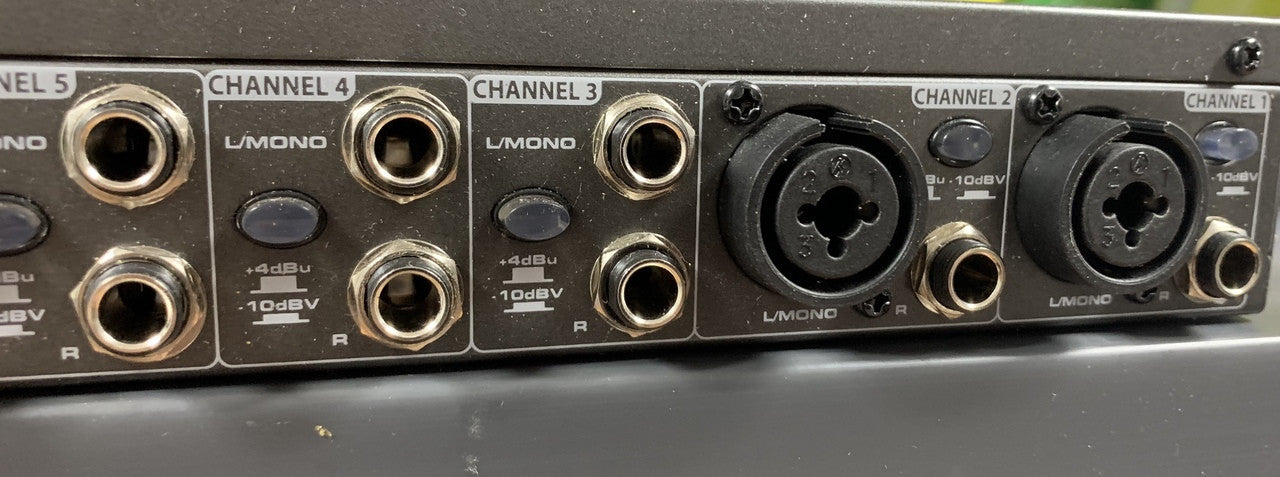 - Ten channels (eight 1/4" stereo line inputs, two combination XLR-1/4" inputs)