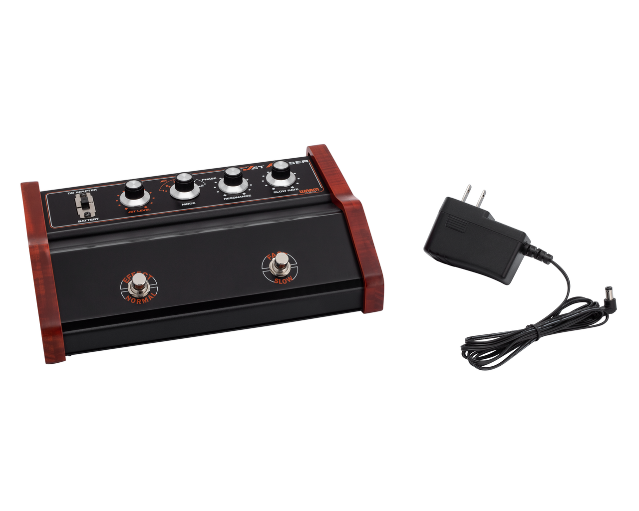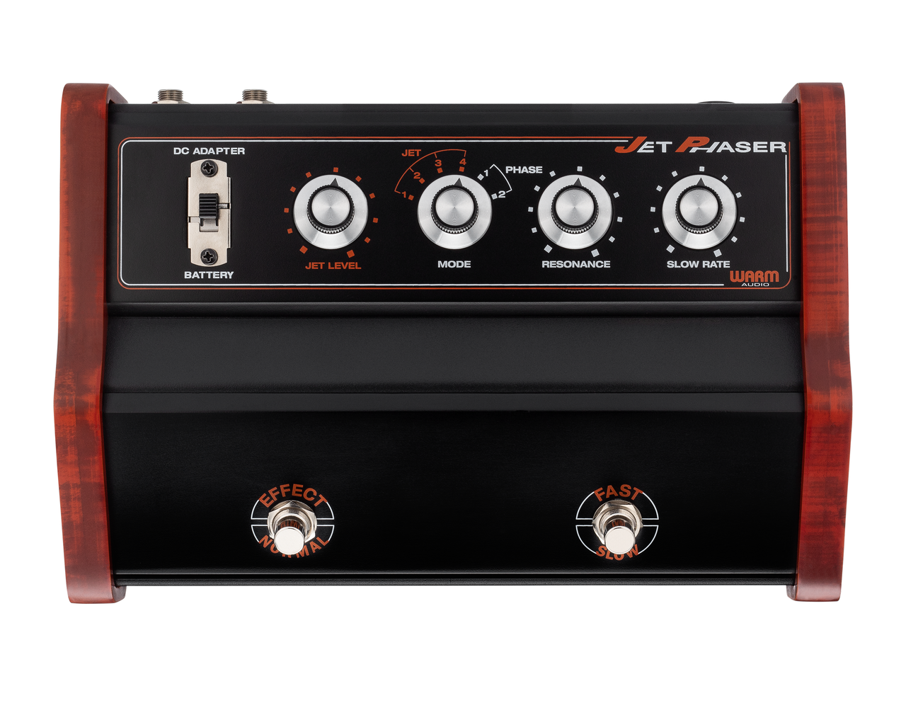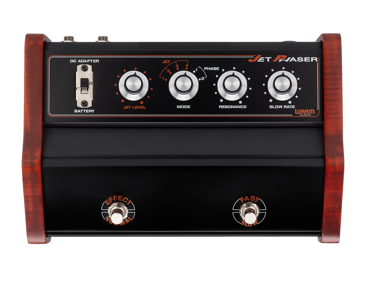 The Jet Phaser also features a RESONANCE control that's available in all six modes, allowing you to dial in varying amounts of filtered sci-fi craziness. Additionally, you get creative control of the modulation rate: the SLOW RATE knob allows you to set the main modulation speed, but hitting the FAST/SLOW foot switch always kicks the rate up to the maximum speed possible. It’s a cool design, because the change from fast to slow ramps up and down gradually like an organ’s rotary speaker. Unlike most phasers, the Jet Phaser can actually get “in-between” speeds by continuously hitting the FAST/SLOW foot switch like organ players do!