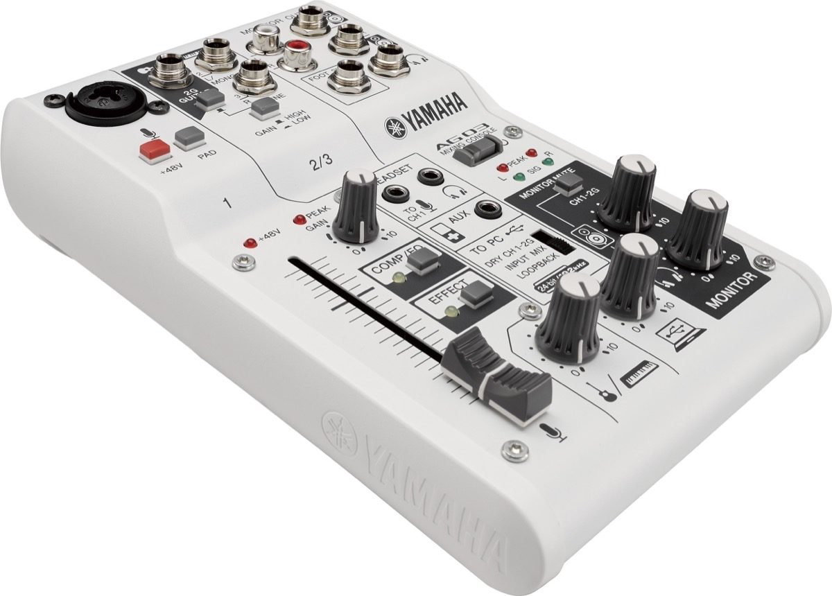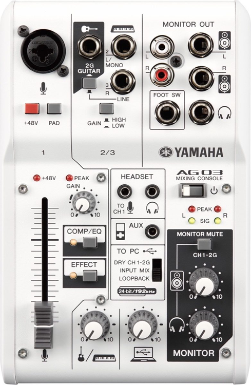 Armed with 24-bit/192kHz audio quality and innovative connectivity, the Yamaha AG03 USB mixer and audio interface aims to be a flexible solution for webcasters, gamers, and mobile musicians. Connect a mic or headset into channel one, add compression, EQ, and reverb, and you've got a radio-ready vocal sound. Plug your guitar into channel two or your keyboard into channel three for direct recording. Complete with a loopback function for easy live streaming, the Yamaha AG03 USB mixer is a smart desktop solution when you need maximum flexibility in a simple, streamlined mixer.