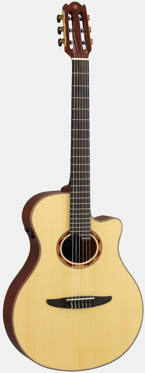 The top-of-the-line Yamaha NTX5 acoustic-electric, nylon-string classical guitar has a modern look and unparalleled amplified sound